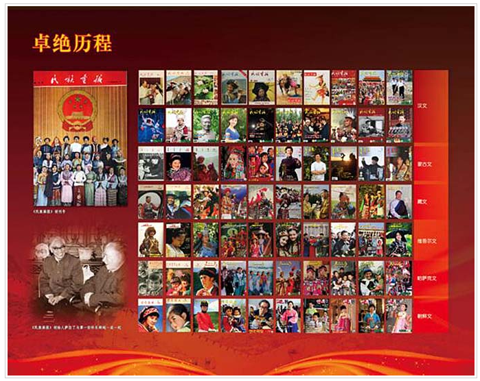 《民族畫報(bào)》創(chuàng)刊于1955年2月,周恩來總理題寫刊名?!睹褡瀹媹?bào)》用漢、蒙古、藏、維吾爾、哈薩克、朝鮮等6種文字出版,發(fā)行全國(guó)各省市區(qū)及世界50多個(gè)國(guó)家和地區(qū),一直與《人民畫報(bào)》《解放軍畫報(bào)》并成為“中國(guó)三大畫報(bào)”。2013年獲“中國(guó)百?gòu)?qiáng)期刊”稱號(hào)