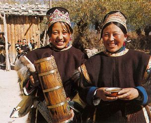 在工布地區(qū),不管是遠(yuǎn)方的來(lái)客,還是常來(lái)常往的朋友,一踏進(jìn)主人的新家,主人首先端出的是香噴噴的酥油茶。如果是尊貴的客人,還要被請(qǐng)到上座。招待來(lái)客時(shí),主人會(huì)敬上酥油茶和青稞酒,尤其是青稞酒,主人要兩手棒著,恭敬地送到客人手上,客人喝一口,主人添一次,連續(xù)三次??腿俗詈笠豢跉獍驯械木坪韧?,這就是通常所說(shuō)的三口一杯。如果客人推辭,主人還要獻(xiàn)上優(yōu)美動(dòng)聽(tīng)的酒歌,以此來(lái)表達(dá)主人的熱情和對(duì)客人的尊敬,直到客人把杯中的酒喝完為上。手捧酒杯,主人依次要給所有的來(lái)客敬上一遍。杯杯醇酒,盛滿了工布人的情和意。那情景,常令在場(chǎng)的人感動(dòng)不已。