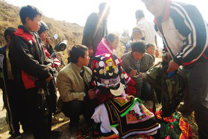 彝族人接親,是通過“搶”的方式進(jìn)行的。接親者想早點(diǎn)兒背著新娘上婆家,而新娘的姐妹們則想讓新娘多留一會(huì)兒。當(dāng)接親者來?yè)屝履飼r(shí),圍在新娘身邊的姑娘們,把煙灰抹在手掌上,或拉著、或抱著、或追著去抹接親的人,那些接親者便一個(gè)個(gè)成為“黑花臉”,讓周圍的人們見了哄堂大笑。