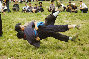 迎親宴畢,一般都要舉行摔跤比賽。先由女方家派人用酒邀請(qǐng),接親隊(duì)伍應(yīng)邀派出選手。在比賽中,只有把對(duì)方摔倒在地才算贏,如果雙方同時(shí)倒地,則比賽無效。