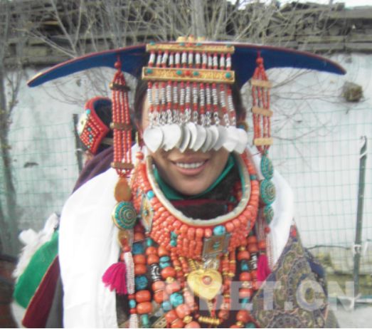 第二種在常規(guī)穿戴時是作為項圈的。金、銀質(zhì)材共同構成的方形裝飾物是項圈的主要構成要素,一般外圍為銀,中間部分為金,在外圍銀質(zhì)部分的四角以及金質(zhì)部分的中間各鑲嵌一塊綠松石。一個項圈上共有三塊此類方形裝飾物,從中間向兩邊,分布協(xié)調(diào)。其他部分以珊瑚珠鑲嵌,并以綠松石為點綴。珊瑚珠的排列密度與珠體大小有關,一般以7—9行者居多。項圈看上去色澤艷麗且顯高貴。那么,項圈怎么又會成為頭飾的呢?原來,在某些特殊場合,尤其是非正式場合下,人們有時便會把項飾取下,“換一種感覺”,把它作為一種休閑“帽子”固定于額頭上。這也體現(xiàn)了普蘭人民在服飾文化方面的創(chuàng)造性。