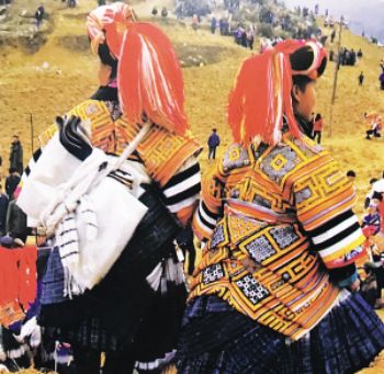要論“疊穿”的數(shù)量之最,則當(dāng)屬貴州大方縣顯母村的苗族女性了。與苗族慣用銀飾的固有印象不同,這里的苗族女性鮮以銀為飾,她們用數(shù)量極為可觀的服飾“疊穿”來(lái)彰顯富裕。節(jié)日里,顯母村的苗族女性換上盛裝——數(shù)條百褶裙系在腰間,塑造出豐腴的臀部造型,內(nèi)層裙子素凈無(wú)花,外層裙子則布滿(mǎn)條帶狀蠟染裝飾。在這個(gè)難得的大型社交場(chǎng)合,未婚女孩通過(guò)“疊穿”后的獨(dú)特造型來(lái)展示自己的魅力,衣物的數(shù)量和精致程度成為了吸引異性、獲得肯定的重要標(biāo)準(zhǔn)和獲得美好婚姻的重要條件。到了婚禮時(shí),女性所著裙子的數(shù)量更是可達(dá)35條?;楹?,她們要在裙邊加上一圈深色邊飾以作標(biāo)識(shí)。