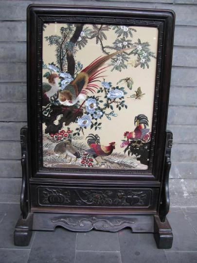 取材于古畫,采用蜀繡的運(yùn)針、輔針、切針、沙針、滾針、打籽針等針?lè)ɡC制。樹木花草層次分明、古樸自然,錦雞蝴蝶色彩艷麗。