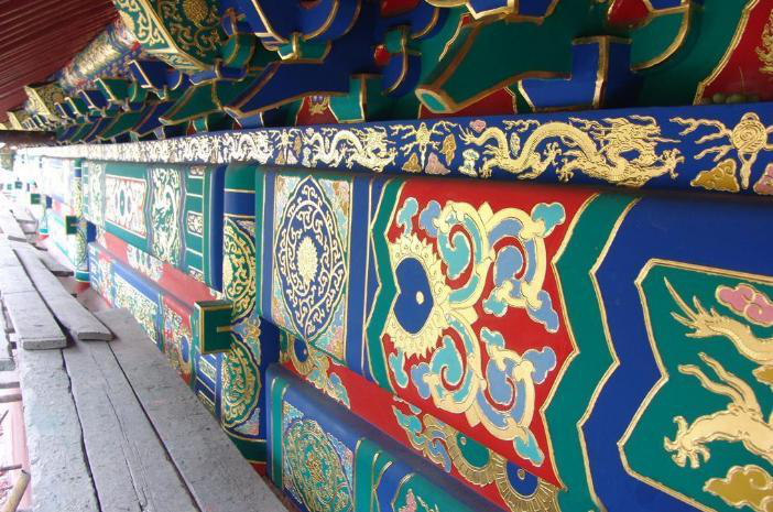 彩畫著色是一項(xiàng)關(guān)鍵的工序,不能有半點(diǎn)差錯。工匠們?yōu)椴煌伾O(shè)定了代號,一米色、二淡青、三香色、四硝紅、五粉紫、六洋綠、七佛青、八石黃、九紫色、十黑煙、十一紅等。將代號直接寫在地仗上,然后根據(jù)色號將各種色料對號入座,涂刷著色一、二遍,待干后再刷一遍光油罩光,以起保護(hù)作用。彩畫所用色料一般均為各色成品油漆。