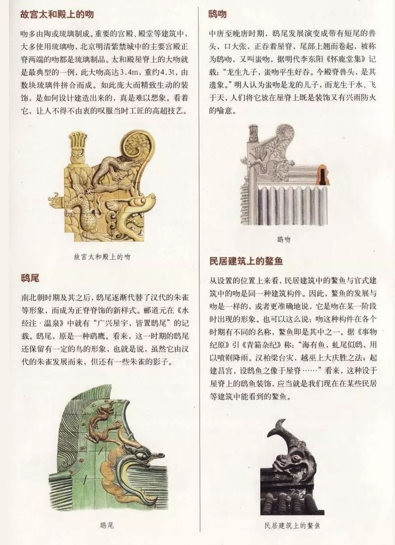 4. 正脊裝飾:在我國古代的很多建筑中,特別是一些等級較高的建筑中,其屋頂正脊上往往設(shè)有各色裝飾。除了常見的正脊兩端的吻合正脊中心的寶頂外,在正脊的前后兩個立面上,還會雕飾或塑有花、草或龍等。