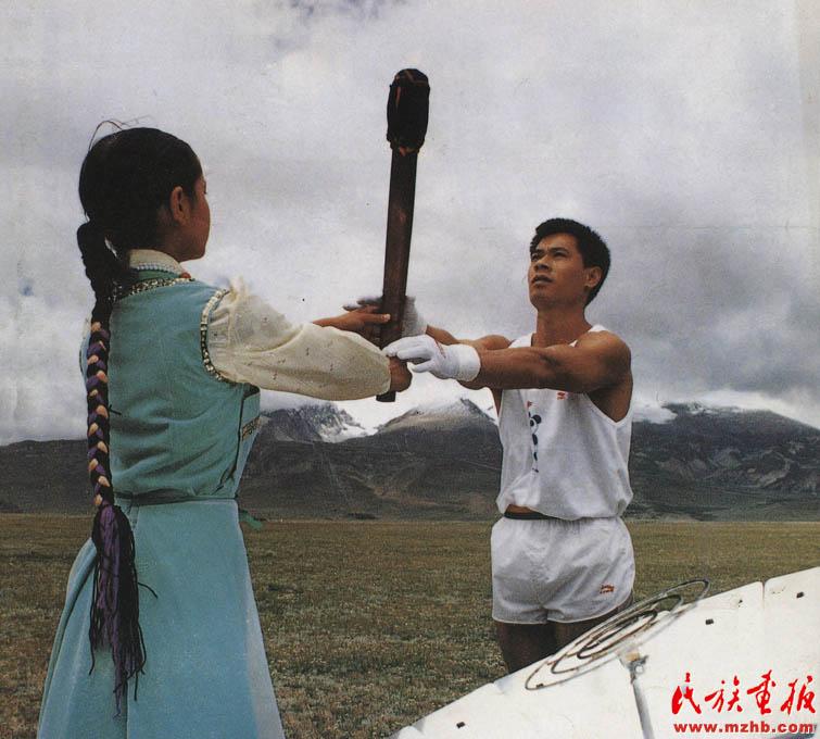 1990年,象征著亞洲30億人民“團(tuán)結(jié)、友誼、進(jìn)步”的第十一屆亞洲運(yùn)動(dòng)會(huì)在中華人民共和國首都北京隆重開幕。8月7日,在西藏的念青唐古拉峰下,藏族少女達(dá)娃央宗點(diǎn)燃火把,傳遞給前世界冠軍、“體操王子”李寧(壯族),李寧接過圣火,點(diǎn)燃了火種盒內(nèi)的火種《民族畫報(bào)》1990年第11期