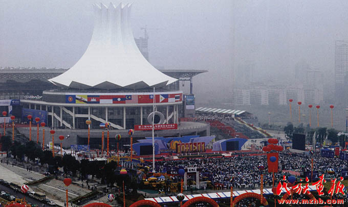 2004年,中國—東盟博覽會(huì)開始舉辦。15年來,中國—東盟博覽會(huì)承載促進(jìn)雙向交流合作的重要使命和催生多贏局面的美好愿景,推動(dòng)中國—東盟經(jīng)貿(mào)合作邁進(jìn)新時(shí)代。圖為2005年第二屆中國—東盟博覽會(huì)開幕式?!睹褡瀹媹?bào)》2005年第12期