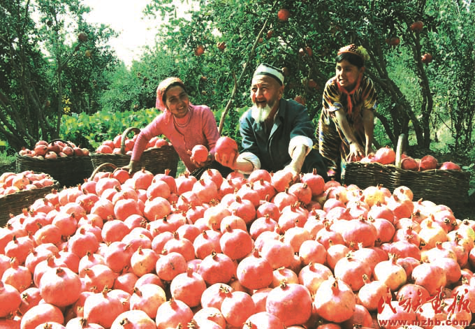 興邊富民行動(dòng)是1999年中央民族工作會(huì)議部署的一項(xiàng)重要的邊境建設(shè)工程,旨在“富民、興邊、強(qiáng)國、睦鄰”。興邊富民行動(dòng)為新疆的發(fā)展帶來了實(shí)惠,2006年,看著豐收的石榴,維吾爾族農(nóng)民樂開了花。《民族畫報(bào)》2007年7期