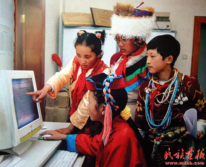曾幾何時(shí),電腦、網(wǎng)絡(luò)等現(xiàn)代化的交流手段離邊疆少數(shù)民族地區(qū)那么遙遠(yuǎn),隨著經(jīng)濟(jì)發(fā)展、國民消費(fèi)水平的提高,一些高科技、現(xiàn)代化的事物在普通群眾中輕而易舉地普及了。圖為2007年,西藏門巴族、珞巴族的兒童在學(xué)電腦。(中國民族圖片庫資料)