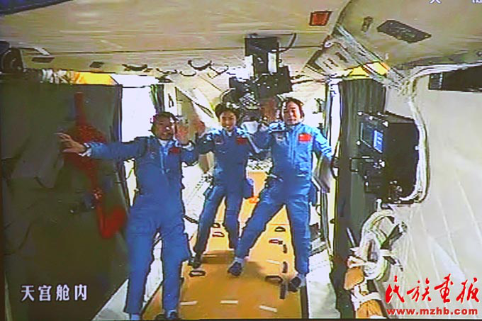2012年6月18日,神舟九號(hào)飛船與天宮一號(hào)完成自動(dòng)交會(huì)對(duì)接,兩飛行器形成穩(wěn)定運(yùn)行的組合體后,三位航天員先后進(jìn)入天宮一號(hào)目標(biāo)飛行器,這實(shí)現(xiàn)了中國載人航天歷史上首次對(duì)一個(gè)在軌運(yùn)行的航天器的拜訪和駐留。圖為在北京航天飛控中心大屏幕拍攝到的航天員景海鵬、劉旺、劉洋在天宮一號(hào)實(shí)驗(yàn)艙內(nèi)的畫面?!睹褡瀹媹?bào)》2012年第7期