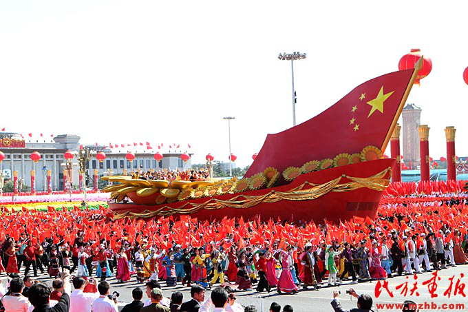 新中國成立以來,黨和國家始終堅(jiān)持把馬克思主義民族理論同中國民族問題具體實(shí)際相結(jié)合,始終堅(jiān)持把民族工作作為一項(xiàng)重大工作來抓,團(tuán)結(jié)帶領(lǐng)全國各族人民共同團(tuán)結(jié)奮斗,共同繁榮發(fā)展,開創(chuàng)了中國特色解決民族問題的正確道路,取得了舉世矚目的成就,積累了彌足珍貴的成功經(jīng)驗(yàn)。2009年10月1日,在北京天安門廣場,20萬軍民以盛大的閱兵儀式和群眾游行歡慶新中國60華誕,圖為各民族學(xué)生參加“團(tuán)結(jié)奮進(jìn)”方陣群眾游行。《民族畫報(bào)》2009年第10期