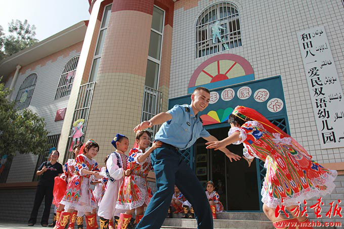 民族團(tuán)結(jié)是國家統(tǒng)一、繁榮昌盛的前提和保證,各民族“共同團(tuán)結(jié)奮斗,共同繁榮發(fā)展”是我國民族工作的主題。全國各地扎實(shí)開展民族團(tuán)結(jié)進(jìn)步創(chuàng)建工作,平等團(tuán)結(jié)互助和諧的社會(huì)主義民族關(guān)系進(jìn)一步鞏固和發(fā)展。2011年,空軍駐新疆和田某指揮所首次投資80萬元,開辦了和田八一愛民雙語幼兒園,讓30個(gè)家庭的孩子進(jìn)入雙語班成為首批“藍(lán)天春蕾兒童”。圖為維吾爾族戰(zhàn)士艾力夏提和該園兒童一起玩老鷹捉小雞游戲?!睹褡瀹媹?bào)》2011年第11期