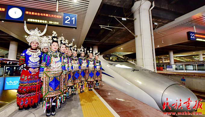 用少數(shù)民族禮儀歡送貴陽(yáng)北站首開(kāi)G4135次至昆明的高鐵(李勇 攝影)