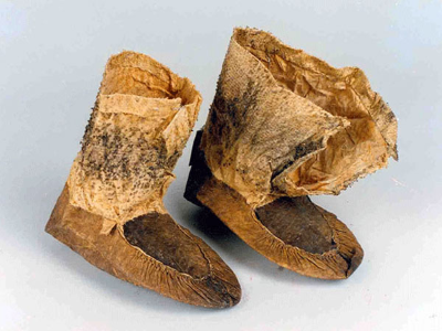 魚(yú)皮靴俗稱(chēng)魚(yú)皮靰鞡,由魚(yú)皮四周整體向上折起,抽褶向上形成底部,前面與鞋臉縫制在一起,形成半圓形,鞋口再用另一塊魚(yú)皮縫上,形成圓筒形靴靿,然后穿繩或皮條做鞋帶。此鞋由身、臉、黝三部分組成。魚(yú)皮鞋既結(jié)實(shí)保暖,又抗寒防水防滑,適于在冰上和泥濘道路上行走及從事漁獵生產(chǎn)。如圖所示。