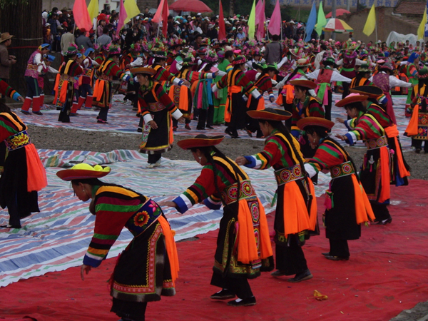 不同地區(qū)的土族舞蹈具有相對獨立性,互助的“安昭”、民和的“納頓”、大通的“踏灰”、同仁的“於菟”、甘肅卓尼的“嘎爾”等是最具代表的民間舞蹈。“安昭”,土語稱之為“千佼日”,意為“彎曲”或“轉(zhuǎn)圈”,是土族民間喜慶節(jié)日和婚禮儀式中,用于禮贊祈祝的一種圓場群舞,也是一種歌舞結(jié)合、無樂器伴奏的集體舞蹈。一般由男女各半圍成圓圈,由一男子帶領(lǐng),一唱眾和。舞蹈動作簡單質(zhì)樸,舞者兩手由右胯旁起向左上方至右上方劃圓弧,變?yōu)樽笫智谀X前,右手高居于后,似雄鷹翱翔于藍天。“於菟”舞即虎舞。“於菟”,是古代楚人對虎的方言稱謂。每年農(nóng)歷十一月二十日祭山神時,名為於菟的舞者在赤裸的上身繪制虎豹圖案,模仿虎的形象“前端腿跳”舞蹈,達到祀神驅(qū)邪、祈求平安的目的。