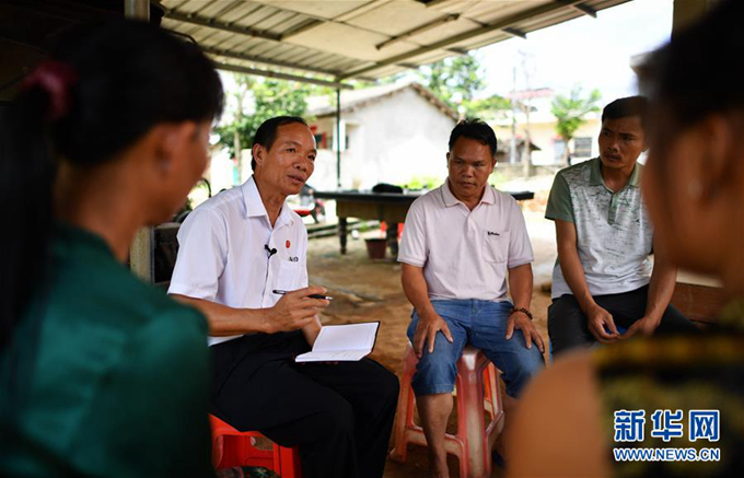 羊風(fēng)極(左)在海南省白沙黎族自治縣打安鎮(zhèn)田表村收集群眾意見(jiàn)和建議