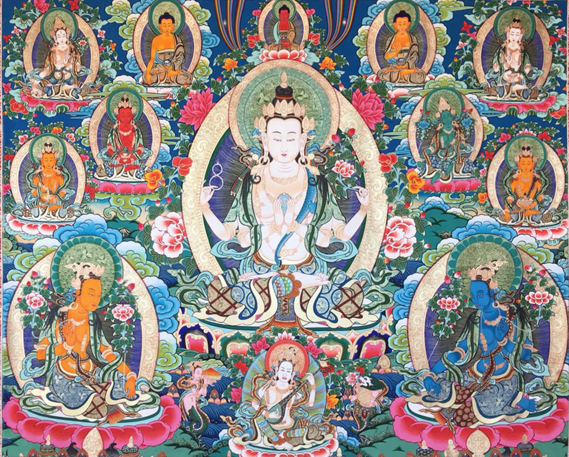 四臂觀音一面四臂,慈悲善良,頭戴五佛冠,身穿輕柔天衣,坦胸露腹,戴著珍寶耳環(huán)、珍寶項(xiàng)鏈、珍寶瓔珞,第一雙手之右手持水晶念珠,左手持八瓣蓮花;第二雙手當(dāng)胸合掌,雙足跏趺于蓮花寶座中央,身后有光環(huán)、祥云、遠(yuǎn)山。