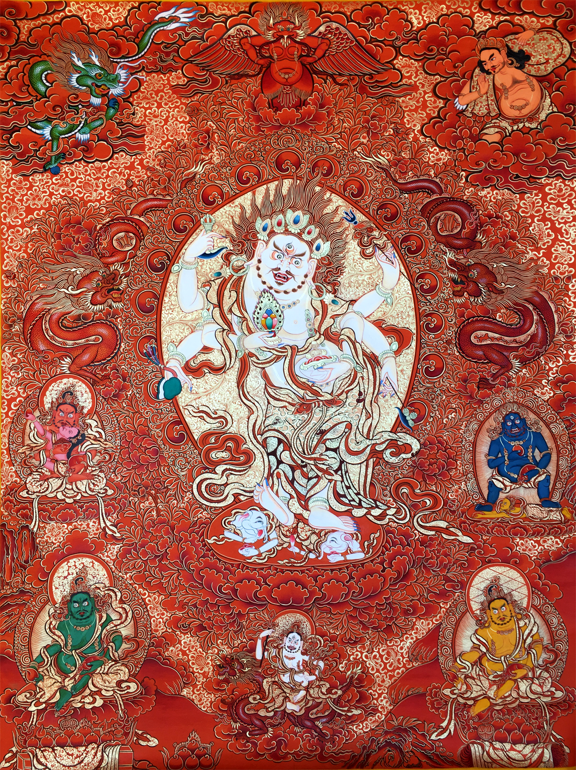 六臂白瑪哈嘎拉正名為白如意珍寶依怙主 。首宏於香巴噶舉,后另傳至薩迦派分支,為特別不共法門,是求財?shù)闹腔圩o法,相傳此尊住於印度清涼尸陀林。此尊身白色,一面六臂三目,須眉毛發(fā)金黃,獠牙外露卷舌相。頭戴寶冠,珍寶瓔珞,天衣彩裙為身莊嚴,身材短胖,并有小鈴華蔓為飾。兩腳作巡行狀,踏於持寶鼠之白象王財神之背。