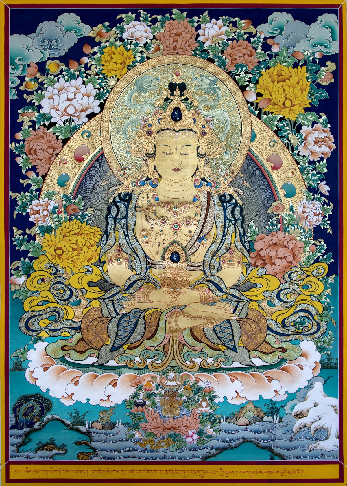 長壽佛(梵名Aparimita āyur jnāna su-vinisˊicita tejo rājāya tathāgata),在漢譯佛經(jīng)中無其形象之記載描述,藏傳佛教中其畫像為一面二臂,肌膚紅色,盤發(fā)成髻戴五佛寶冠,上穿天衣,下著綢裙,身佩珍寶瓔珞,具足一切報身佛的種種莊嚴,雙手結(jié)禪定印于膝上,托長壽寶瓶,雙足以金剛雙跏趺安住于蓮花月輪上。