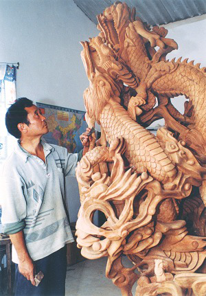 今年54歲的李元生,以雕龍而遠(yuǎn)近聞名。早在上個世紀(jì)80年代初,他創(chuàng)作的第一件根(木)雕作品《困龍也有上天時》,便被一位游客購買收藏。在近20年的時間里,一些常人眼里只能當(dāng)柴燒的樹根,在他獨特的構(gòu)思和飛舞的刻刀中,變成了上百件大小不一的富有生命力的根(木)雕作品。其中的代表作有:《九龍傳說》、《送子觀音》、《長壽九千年》、《金龍獻(xiàn)寶》、《哪吒鬧海》、《1999——人與自然》等。這些作品,不少被省內(nèi)外的單位和個人作為珍品收藏。