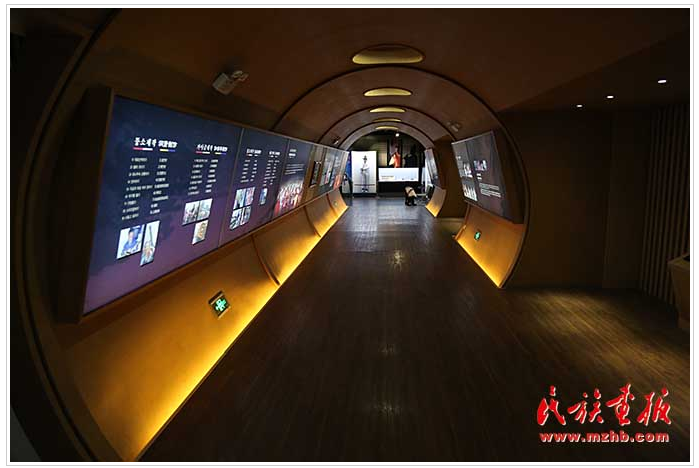 一樓展廳主題為“舞樂風(fēng)情”,展廳墻體為一道曲線,別致新穎,據(jù)了解,展示舞蹈的曲線墻設(shè)計(jì)靈感來自朝鮮族象帽舞?!跋竺蔽琛笔寝r(nóng)樂舞拓展項(xiàng)目,國家級非物質(zhì)文化遺產(chǎn),是朝鮮族“農(nóng)樂舞”中表演難度和藝術(shù)價值最高的表演形式。參觀者走進(jìn)互動體驗(yàn)區(qū),可以戴上象帽體驗(yàn)飄帶飛舞的熱烈奔放感?!跋竺蔽琛钡娘h帶不斷向上盤旋,代表著朝鮮民族對未來生活的祝福。