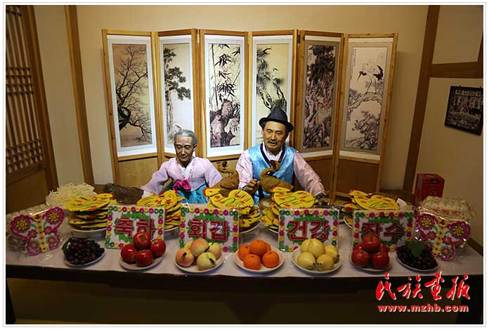 朝鮮族人民非常注重禮節(jié),尤其崇尚尊老愛幼的傳統(tǒng)美德。步入廳堂,回婚禮(為紀(jì)念結(jié)婚60周年而舉行的賀禮)中,新郎新娘的蠟像引得大家駐足觀看,新郎的衣著形似明朝時期的官服,頭戴官帽,據(jù)說“新郎官”的稱謂就由此而來。隆重的回婚禮教育人們忠于愛情,也是儒家思想中“修身齊家治國平天下”中的“齊家”思想的延續(xù)。走進(jìn)另一廳堂,朝鮮族的花甲禮,六十為一甲子,花甲之意來源于此?;锥Y是朝鮮族家庭為60歲老人舉行的大型生日宴。在擺滿各種花色的食品的“大席”前,兩位老人面南端坐,接受兒孫、親朋好友的跪拜與祝福。