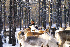 人類馴養(yǎng)馴鹿的歷史有1000多年。這是一種異常勇敢的生靈,生活在北極圈附近,分布在歐亞和北美大陸及一些大型島嶼。在極度惡劣的自然條件下,馴鹿為了繁育后代,每年都要冒著生命危險(xiǎn)長(zhǎng)途跋涉數(shù)百里,其堅(jiān)韌不拔的意志力和不屈不撓的品格正是北極冰原精神的象征。在中國,馴鹿棲息在大興安嶺北段的寒溫帶針葉林中,處于半野生狀態(tài),這里有激流河、阿穆爾河、阿巴河、呼瑪河,有阿龍山、奧克里堆山等。食物主要是苔蘚,也吃石蕊、蘑菇及大木植物的嫩枝葉。鄂溫克族的祖先把鹿視為圣潔,賦予其許多美麗的神話和傳說。是啊,只要有了馴鹿,鄂溫克人便是幸福的。據(jù)考證, 我國的馴鹿與貝加爾湖東北部尼布楚河上游溫多苔原高地的馴鹿有淵源關(guān)系??梢哉f,鄂溫克人的馴鹿、狩獵、樺皮文化、薩滿教把北極文化延伸到了興安嶺。