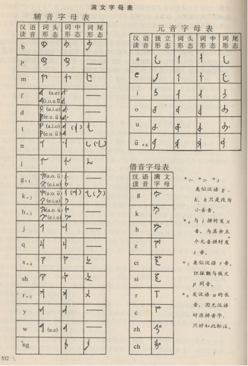 滿文字母除在開音節(jié)的單音節(jié)詞以其獨立形態(tài)出現(xiàn)外,每一個字母處在多音節(jié)詞和閉音節(jié)的單音節(jié)詞的詞首、詞中、詞末時,分別有不同的書寫形態(tài)。書寫滿文單詞時,先自上而下連續(xù)書寫字母的主干,再按先左后右、先上后下的順序依次添加點或圈。滿文書寫格式是左起向右移行。