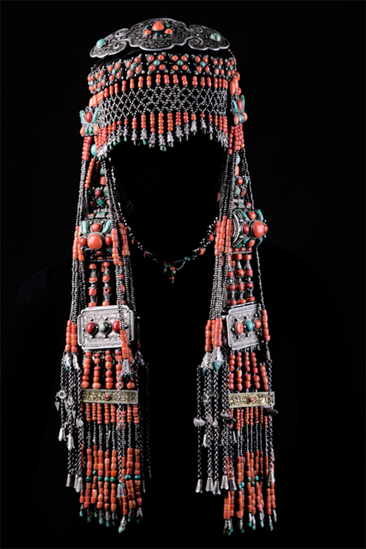 髻側流蘇飾:系于鬢角兩側,其上部銀飾造型從整體上看似飛翔狀蝴蝶,鑲嵌精美紅珊瑚珠、綠松石,造型熱情似火。蝴蝶銀飾之下垂系五條流蘇, 由紅珊瑚珠、綠松石珠及銀珠串間隔穿成五段,下墜蝴蝶型銀飾帽, 內銜桃形瑪瑙墜,流蘇在鬢角兩側隨頭的轉動而飄擺, 響聲清脆。