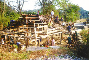筆者看到的干欄式木樓和吊腳樓在使用的功能上相差無(wú)幾,上層住人待客,樓下四壁用木板圍擋,圈養(yǎng)畜禽,存放燒柴、農(nóng)具和秋收臨時(shí)堆放的糧食。豬圈靠里側(cè)依柱圍欄,其它空閑的地方打掃得干干凈凈,有的將織布機(jī)放在樓下明亮的地方。住房一般5間,兩頭兩間是偏廈,中間3間是寬敞的堂屋,一頭設(shè)火塘、土灶,為烤火、煮飯之處;另一頭的中柱供臨時(shí)設(shè)席敬神之用,也有的在板墻上設(shè)佛龕神位,供奉祖先;臥室依房柱用木板靈活隔間。大門有的開在房山墻一側(cè),也有開在中間的,皆登石階、板梯而上。吊腳樓一棟挨著一棟,小巷道曲折狹窄,只容牽牛和順向挑擔(dān)通過(guò)。