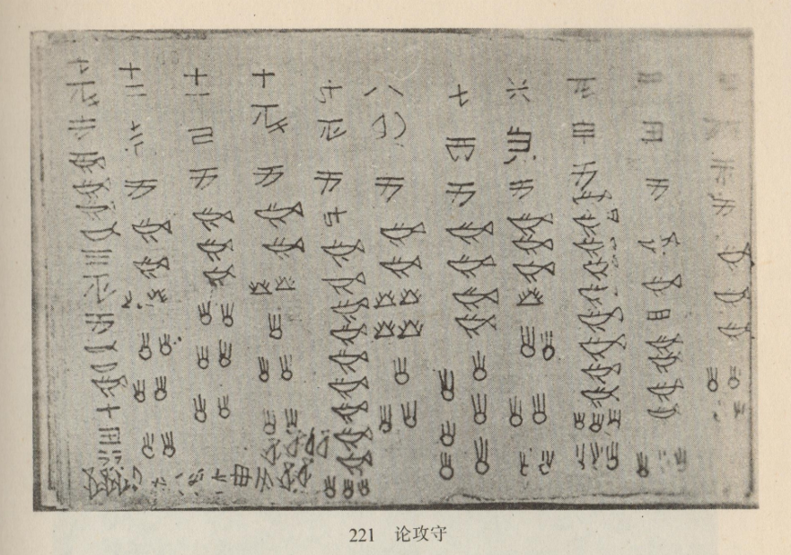 水書抄本。寫于清嘉慶年間,共20頁,長18厘米,寬27厘米。以竹簽作筆蘸墨書寫。內(nèi)容述戰(zhàn)爭陣法。中圖魚形表示守方,方框?yàn)橹笓]位置,三角形表示山頭陣地,圓圈加三畫表示進(jìn)攻之?dāng)硵⊥诵蜗?。原件存北京圖書館。