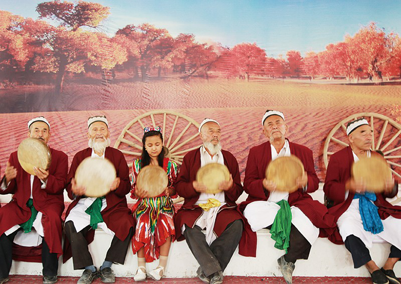 11歲的麥迪娜是小學(xué)五年級(jí)的副班長(zhǎng),在麥蓋提一小雙語(yǔ)班讀書(shū),漢語(yǔ)好到可以給我做翻譯,向老藝人提問(wèn)。麥迪娜的世界已經(jīng)和老藝人、和叢林中艱難漁獵的祖先不一樣了。她在麥西來(lái)甫中敲達(dá)甫手鼓,在活動(dòng)中心學(xué)習(xí)電子琴,是女子“手鼓樂(lè)隊(duì)組合”中8位11—3歲女孩子中的一個(gè)。她希望將來(lái)能在北京上學(xué)、成為醫(yī)生治好奶奶的糖尿病。她會(huì)用漢語(yǔ)唱國(guó)歌和《歌聲與微笑》,還有《茉莉花》,雖然吐字與調(diào)子不太那么準(zhǔn)。她圍著阿布都克萊姆(被稱(chēng)作“維吾爾人的趙本山”的維吾爾族諧星)索要簽名的同時(shí),還喜歡羅志祥,以韓國(guó)偶像組合EXO為榜樣。麥迪娜還上過(guò)電視,常有喀什地區(qū)的、自治區(qū)的、全國(guó)的媒體到麥蓋提來(lái)采訪(fǎng)、錄制刀郎麥西來(lái)甫。