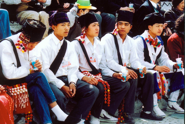 景頗族男子喜歡穿白色或黑色對(duì)襟圓領(lǐng)上衣,包頭各地略有差別,隴川縣北部王子樹、盈江銅壁關(guān)一帶的男子過(guò)去纏青布包頭或紅花格包頭,浪速纏紅布包頭,瑞麗、潞西和隴川的景頗族纏有絨球的白包頭。男子衣褲基本相同,穿對(duì)襟衣和長(zhǎng)褲?,F(xiàn)在的景頗族男子穿傳統(tǒng)對(duì)襟衣的已經(jīng)變少,多數(shù)改穿現(xiàn)代男裝。景頗族男子外出時(shí)常佩帶腰刀、筒帕、火槍等,以便自衛(wèi)和打獵。景頗族諺語(yǔ)中有“景頗山的路是長(zhǎng)刀砍開的,赤腳踩亮的”“男子不會(huì)耍刀,不能出遠(yuǎn)門”的說(shuō)法。景頗男子十分喜愛長(zhǎng)刀,把刀視為第二生命,稱長(zhǎng)刀為“日恩途”,意為生命刀。景頗族中老年男子一般用紅、黑、白等色布作包頭,留長(zhǎng)發(fā),戴耳環(huán),佩戴銀項(xiàng)圈、銀手鐲。上衣以黑色為主,對(duì)襟,用銀吊做扣子。褲子短而寬,褲口用紅色、白色線繡花邊。黑布綁腿,腿套黑藤圈。青年男子頭包繡花包頭,身穿白襯衫,黑色對(duì)襟上衣。褲子短而寬,褲口用紅、白線秀花邊。腰系繡花腰帶,寬約5寸,長(zhǎng)約3尺。未婚的青年男子常把情人贈(zèng)送的耳環(huán)戴在耳朵上,項(xiàng)圈套在頸上。