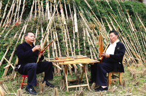 隨著日子的臨近,有些村寨的蘆笙手干脆包米包菜到莫師傅家守候和督促。大量訂戶的到來使莫師傅的工作室變得擁擠不堪。莫厭學(xué)、莫里學(xué)兩兄弟干脆把制作蘆笙的工作室搬到室外,把最近2個月來制作的1077把蘆笙也搬到室外逐一進行檢修和校音。