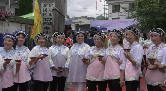 布依族青年們抬著族中神物銅鼓,吹著長長的號角,臉上滿是對民族節(jié)日的期待之情,驕傲又興奮;成群結(jié)隊的孩童穿著本民族傳統(tǒng)服飾,手拿錦帶,熱忱歡迎遠(yuǎn)道而來的客人;能歌善舞的布依阿姐笑臉相迎,唱著布依族的歌謠,一字排開堵在門前,客人們想要進(jìn)去參加這次盛會,就得過三關(guān),干了三碗攔路酒。