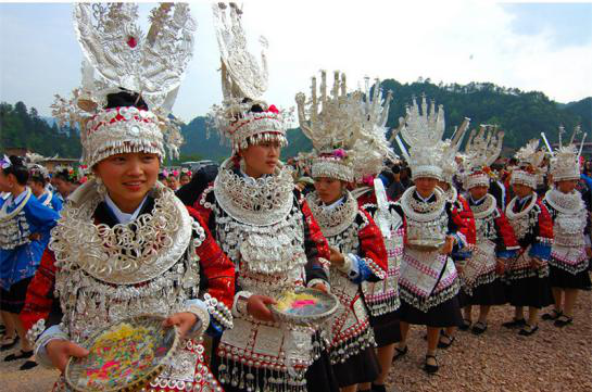 銀飾作為苗族最喜愛的傳統(tǒng)飾物,主要用于婦女的裝飾,品種多樣,分為頭飾、面飾、頸飾、肩飾、胸飾、腰飾、臂飾、腳飾、手飾等,彼此配合,體現(xiàn)出完美的整體裝飾效果。苗族銀飾常出現(xiàn)于苗族的喜慶場合,蘊(yùn)涵有避邪趨正、納福迎祥的寓意,具體生動地反映著苗族人民的生存狀況、精神面貌和審美心理,具有很高的歷史文化研究價(jià)值。在對外交往中,苗族人民把銀飾作為禮品贈送友人,和藏族的哈達(dá)、漢族的珠寶一樣珍貴。