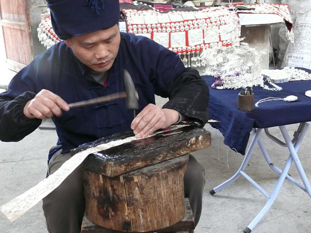 苗族銀飾鍛制技藝歷史悠久,先后經(jīng)歷了從原始裝飾品到巖石貝殼裝飾品、從植物花卉飾品到金銀飾品的演進(jìn)歷程,傳承延續(xù)下來,才有了模式和形態(tài)基本定型的銀飾,其品種式樣至今還在不斷地翻新,由此形成的飾品鏈條成為苗族社會演進(jìn)的象征之一。貴州省雷山縣、黃平縣、劍河縣、臺江縣和湖南省鳳凰縣五個地區(qū)的苗族銀飾鍛制技藝已入選國家級非物質(zhì)文化遺產(chǎn)名錄。