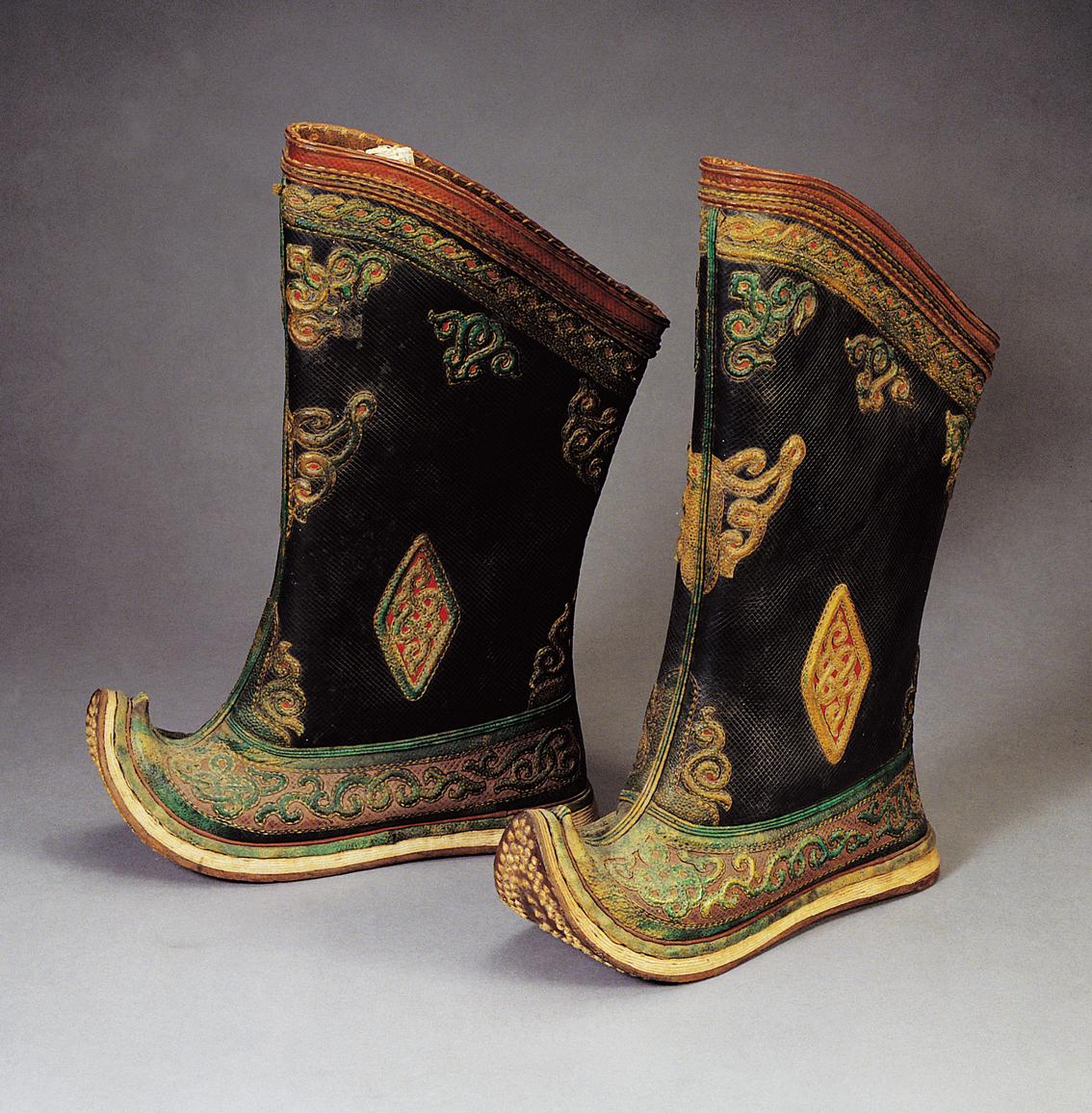 【圖為蒙古族民國時期貼花納底翹尖牛皮男靴,中央民族大學民族博物館館藏】