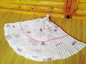 摩梭傳統(tǒng)手工百褶裙 阿七獨(dú)支瑪(參展人): 媽媽把許多古老的摩梭圖案編進(jìn)裙布里,并在裙布下方織一條不接頭的紅線,代表生命的輪回,這是摩梭人的一種人生觀。摩梭女性穿的裙子是百褶裙,媽媽編織好圖案及棉布衣后,還要再一個一個地縫上褶線,雖然很花工夫,但制作衣服的時候,是我見過的媽媽最開心的時候。