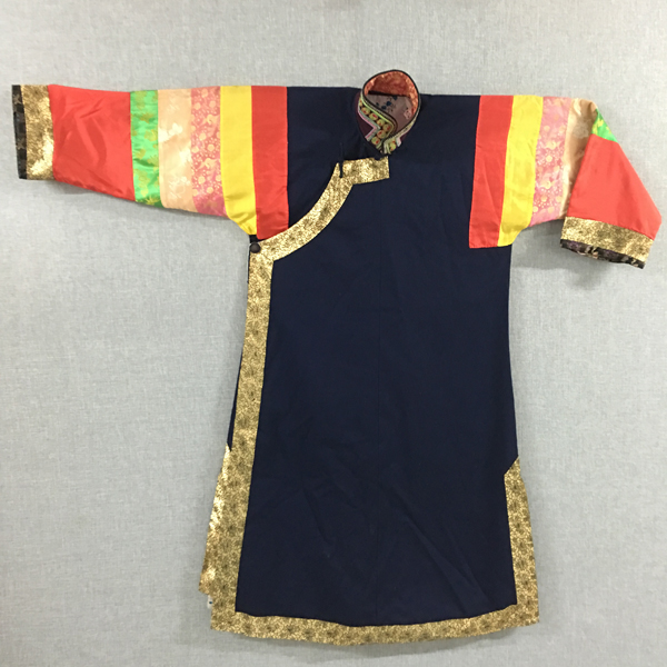 民族文化宮博物館收藏的這件立領(lǐng)右衽大襟五色袖“彩虹衣”,是土族女子盛裝時(shí)的一種服飾,征集于青海省互助土族自治縣。年代為20世紀(jì)30年代?!安屎缫隆遍L117厘米,胸圍120厘米,袖長59厘米,棉質(zhì)。整件女服右衽大襟,藍(lán)棉布襯里,左右側(cè)開衩,黑色“拉花”立領(lǐng),領(lǐng)上以土族傳統(tǒng)刺繡工藝—盤繡刺繡紅綠相間圓形圖案和辮形線條,綴三枚金色圓銅扣。衣袖為紅、黃、綠、白、粉五色彩布、彩緞拼接的“彩虹袖”,其中紅色為主色,占整個(gè)衣袖約一半面積,其余四色布塊相鄰,均勻分布于衣袖上方,布塊上刺繡有金色梅、蘭、竹、菊圖案。衣袖袖口鑲寬約3厘米黑色絲絨底刺繡花邊,花邊里外均繡有花草紋樣,做工精致?;ㄟ吷辖訉捈s10厘米金色牡丹紋花邊,與襟邊、下擺、衩口等處所貼金色牡丹紋花邊相互呼應(yīng),極富設(shè)計(jì)感。
