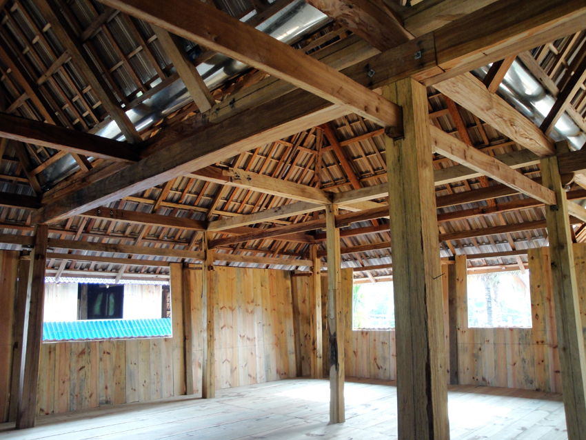德宏瑞麗一帶的竹樓由“干欄”和平房兩部分組成,“干欄”是住房,平房是廚房。“干欄”多為長方形,下層架空,可堆放雜物。上層做橫向分割,成一間堂屋和數(shù)間臥室。堂屋中設(shè)有火塘,一般用于燒茶,在一角設(shè)有佛龕。堂屋外有開敞的前廊和曬臺。屋頂為歇山式,脊長,坡面平緩,外墻開窗,有的還是落地窗,墻與屋頂之間有縫隙,這些都加強(qiáng)了室內(nèi)空氣的流通,達(dá)到了室內(nèi)陰涼的效果。
