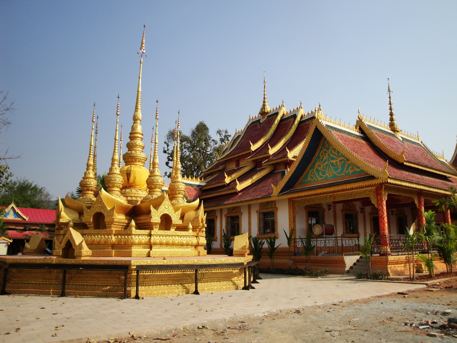 佛寺建筑是信仰小乘佛教的傣族地區(qū)建筑的一大特色,以落地重檐多坡面平瓦建筑為主。由大殿、僧舍和鼓房組成,中心佛寺外加一座戒堂、一座藏經(jīng)樓、一座佛塔。主殿外觀一般是單檐或重檐歇山式屋頂,或懸山式頂、多角或亞字形重檐歇山式頂。坡面進(jìn)行一至二次跌落后有兩層或上中下三層的單面坡或三面坡、五面坡,坡面的多少和佛寺的級別有關(guān)。屋面按縱向分為兩段式或三段式或五段式,以中間最高,使龐大威嚴(yán)的屋面呈現(xiàn)出優(yōu)美起伏的曲線。