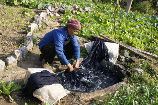 從前壯族鄉(xiāng)村,普遍掌握制作藍(lán)靛及印染方法。一般置一大缸,將藍(lán)草放入浸泡,加石灰使之分解、發(fā)酵,經(jīng)過(guò)化學(xué)變化,而后濾去殘?jiān)舭l(fā)水分,凝成糊狀藍(lán)色染料。其間需不斷攪動(dòng),使色素充分化解?!懊康宀萘俳?,造成一百斤之靛為佳?!币虍a(chǎn)量較多,遠(yuǎn)銷(xiāo)廣東。浸染時(shí),將適量靛糊化于染缸中,同時(shí)將雞血藤搗碎加入。布要反復(fù)浸泡多次,晾泡結(jié)合,直到染為深藍(lán)色。其間雞血藤釋放出一種紫紅色的植物膠,將藍(lán)靛色素粘在纖維上,是色素耐水耐腐耐紫外線,不易褪色,并有若隱若現(xiàn)的亮點(diǎn),結(jié)實(shí)美觀。這個(gè)過(guò)程,運(yùn)用了化學(xué)分解法。