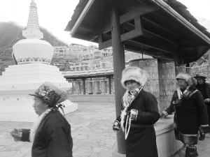 甘堡藏寨的村民們在轉(zhuǎn)經(jīng),他們的身后是“修舊如舊”的藏式民居