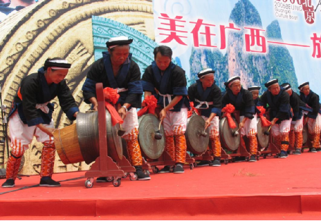 銅鼓舞,在廣西都安、巴馬、東蘭、馬山一帶的瑤族地區(qū)盛行。每年農(nóng)歷五月二十九過“祝著節(jié)”(年節(jié)),要敲12天銅鼓,表示懷念祖宗和預(yù)祝豐收。節(jié)日隆重,聚眾數(shù)以千記。跳舞時(shí),用銅鼓一對(duì),其意一雌一雄,公聲小,母聲大。由兩男敲擊,兩男持雨帽回環(huán)擊鼓者扇搖,還有兩男兩女,應(yīng)鼓樂節(jié)奏翩翩起舞,舞姿雄健優(yōu)美,氣氛熱烈,十分感人。