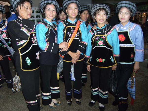 西南地區(qū)的服飾分布地區(qū)包括貴州省黔南布依族苗族自治州羅甸,黔西南州望謨、冊亨、貞豐、安龍、興義、興仁、安順市的鎮(zhèn)寧、關(guān)嶺、紫云三縣的南部以及云南省羅平等縣(市),基本上都屬于布依語第一土語區(qū)。這個(gè)地區(qū)婦女普遍穿大襟衣、長褲腳。衣服的盤肩、袖口、襟沿鑲有蘭干。褲腳為大褶邊,或藍(lán)色褲腳鑲一截青布和蘭干。衣服的長短和褲腳的大小,各地區(qū)都不相同。冊亨一帶衣服較短,褲腳短小,包花格長帕,胸頸掛彩珠項(xiàng)圈,手套玉石或骨制手鐲;望謨一帶青年婦女把花格帕折疊后纏戴;貞豐一帶的衣服較長,褲腳不折邊,青年和老年婦女基本相同,但青年婦女包的花帕形狀如牛角(人稱“牛角帕”);靠近北部地區(qū),衣褲都較長,而且不鑲蘭干,衣褲和帕子多為青色;安龍、興義一帶則多包白帕,衣褲亦不鑲蘭干;西南一帶地區(qū)衣褲已漸不鑲蘭干,但還穿自織的土布衣服,頭上還包花格帕,一些地區(qū)與漢族婦女裝束完全一樣了。