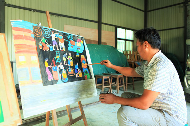喊沙寨的農(nóng)民畫家吞也正在作畫,畫中描繪的是傣族群眾的釀酒過程