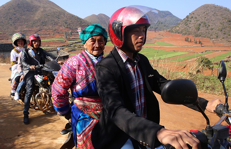 依布底一起去踩花山的人組成長(zhǎng)長(zhǎng)的摩托車(chē)隊(duì),老阿婆腰桿筆挺盛裝坐在摩托車(chē)后座上。等他們來(lái)到大布紅村的花山場(chǎng)時(shí),那里早已人山人海,空地上山坡上也擠滿(mǎn)了衣著鮮艷的人群。