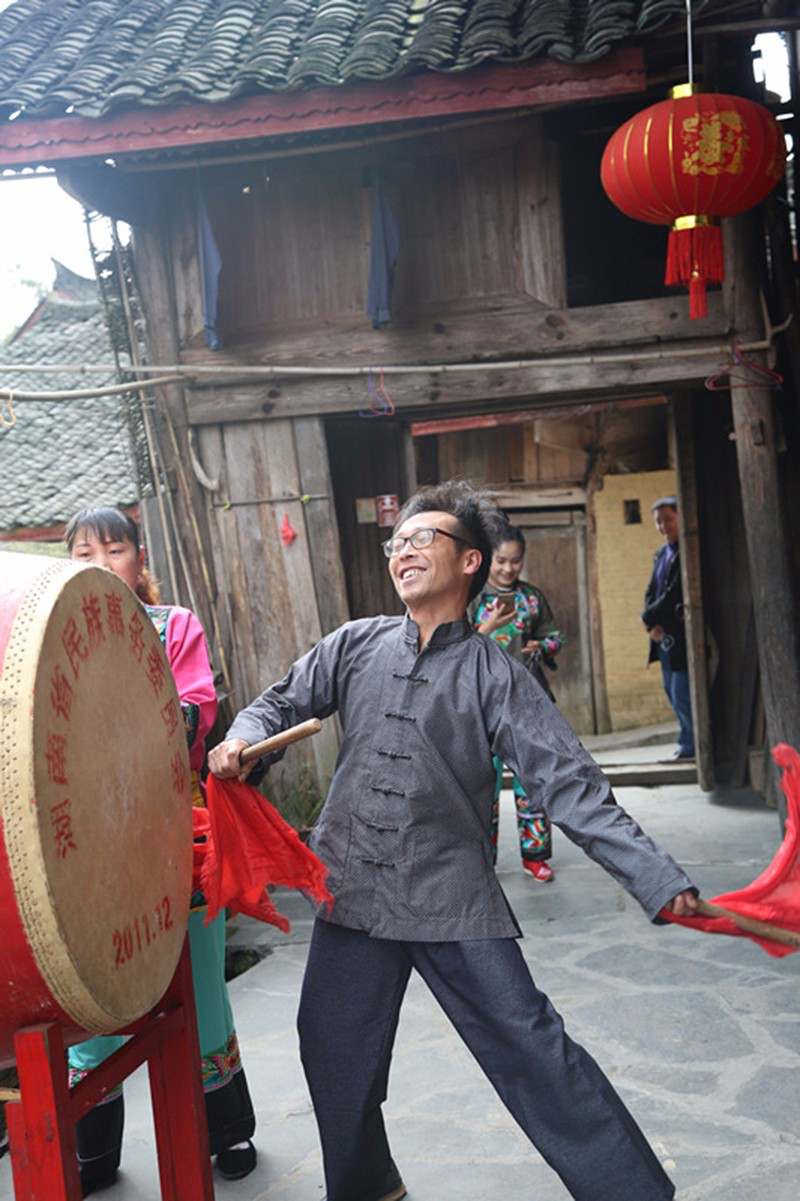 在“幸福人家”客棧門前,楊超文與妻子神采飛揚(yáng)地敲響了苗鼓