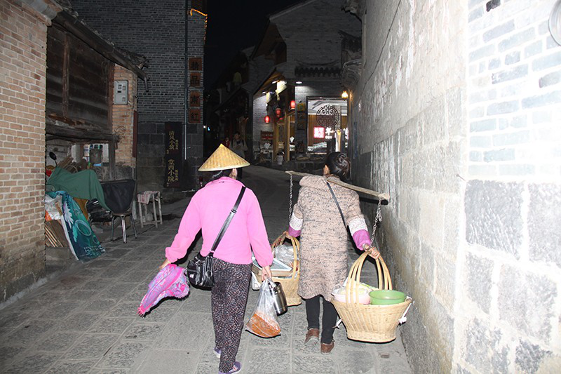 晚上7點(diǎn)多鐘,一群在小河里撲騰了一天的鴨子排著隊(duì)憨態(tài)可掬地回到寸家灣巷口,忙碌一天的人們也開始回家。我正擔(dān)心晚上約定的采訪找不到地方,卻在圖書館旁邊的小巷里碰到了收工回家的姜聰留。她今天的松花糕賣了一板半,收入100多元。同行的一個(gè)姐妹幫她挑著擔(dān)子,姜聰留自己提著袋子和板凳,一路無語。臨近家門的路口,姜聰留從姐妹肩上接過擔(dān)子,眼神默契相視后,各自回家——這就是她們的生活。晚飯姜聰留到丈夫的大哥家吃土鍋?zhàn)樱瑑杉业脑鹤又桓粢粔?,我也跟著進(jìn)了大哥江宗良的家門。